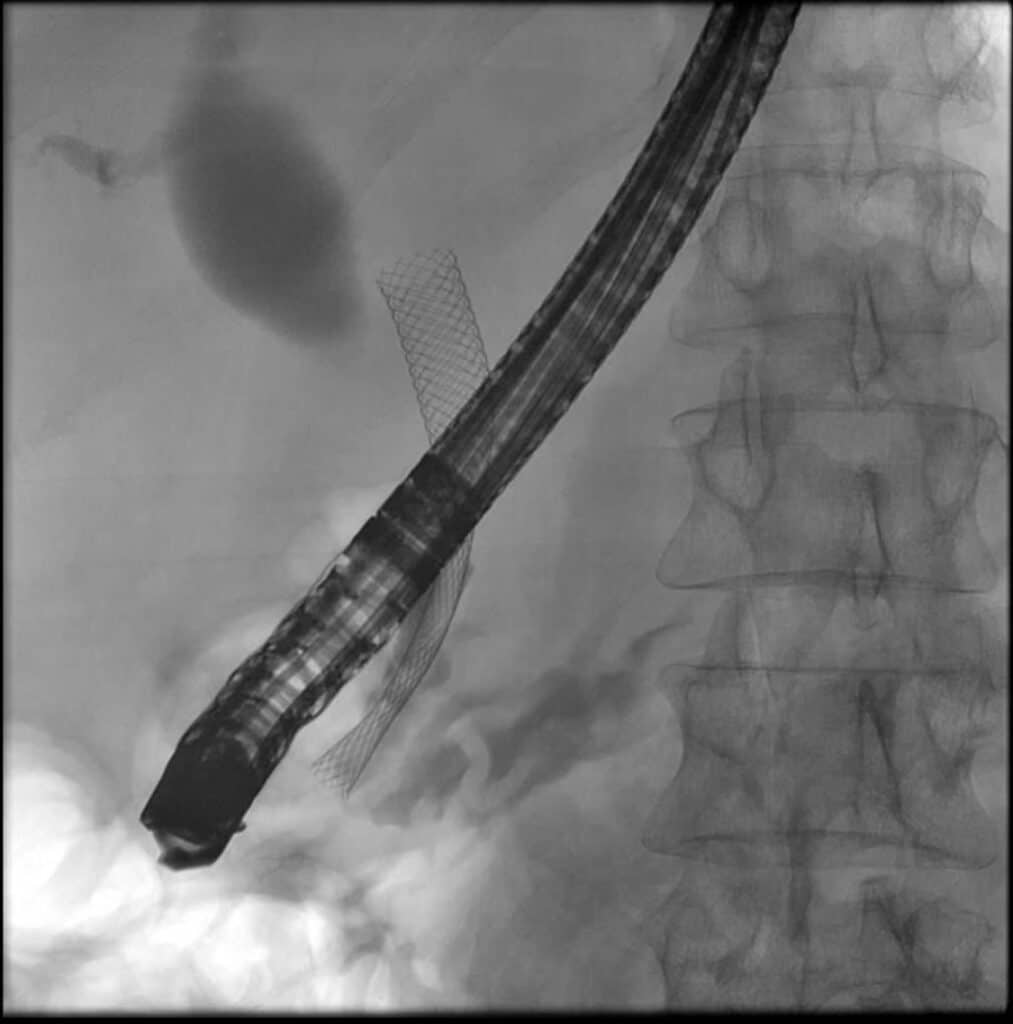 Die Patientin wurde wegen eines schmerzlosen Ikterus vorstellig. Nach sonographischer Beurteilung mit Nachweis eines unklaren Pankreaskopfprozesses mit Doppelgangzeichen wurden EUS und ERCP zur weiteren Diagnostik und Therapie durchgeführt: Endosonographisch sahen wir atrophes Parenchym bei massiv dilatiertem Gangsystem, intraductal stellten sich wandständige papilläre Binnenstrukturen dar; im Kopfbereich wurde zudem eine inhomogen-echoarme Raumforderung abgrenzbar. Umgebend sahen wir vergrößerte Lymphknoten. Bei Nachweis mehrerer „worrisome features“ nach Fukuoka-Kriterien erschienen diese Veränderungen als dringend verdächtig für eine maligne transformierte IPMN. In der Pankreatikographie zeigten sich zudem typische Füllungsdefekte einer MD-IPMN, nach KM-Füllung des DHC erschien eine hochgradige distale Stenose dessen. Der Galleabfluss wurde durch Einlage einer biliären Prothese wiederhergestellt.
